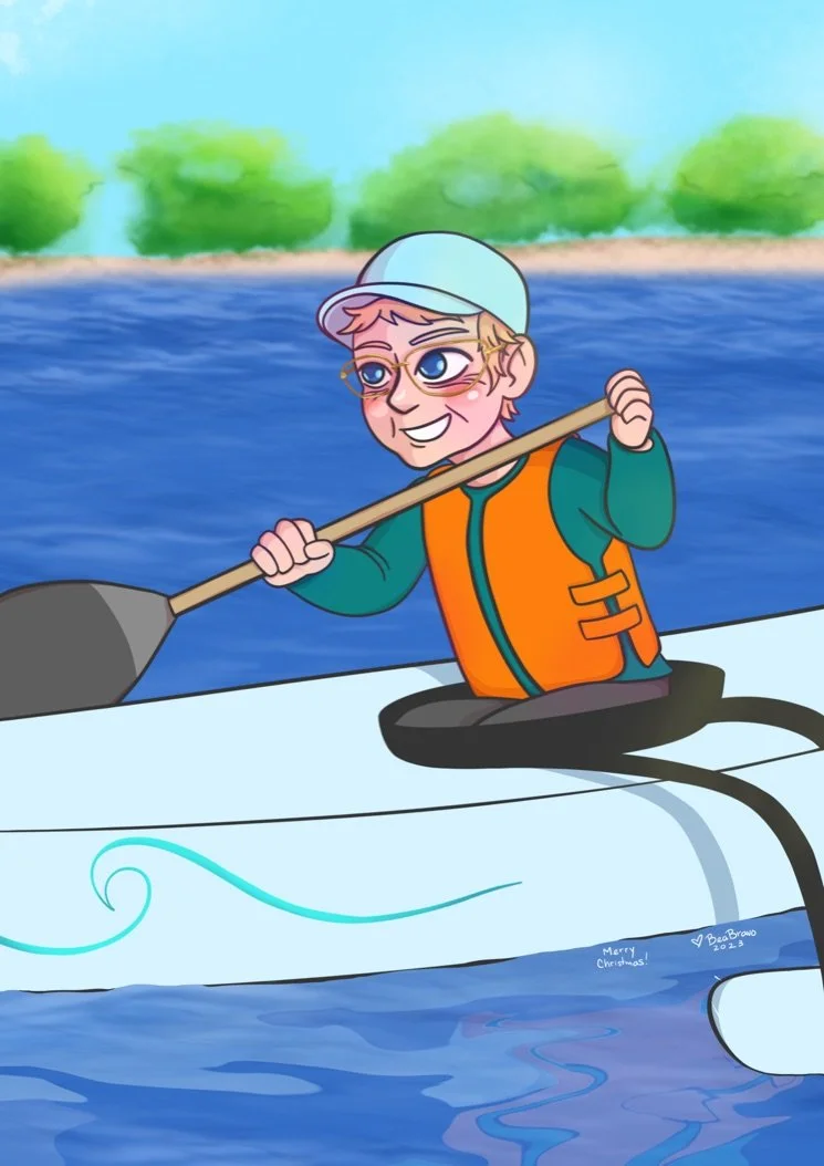 Client provided pictures of his mother to be stylized into a cartoon of her paddling activity.