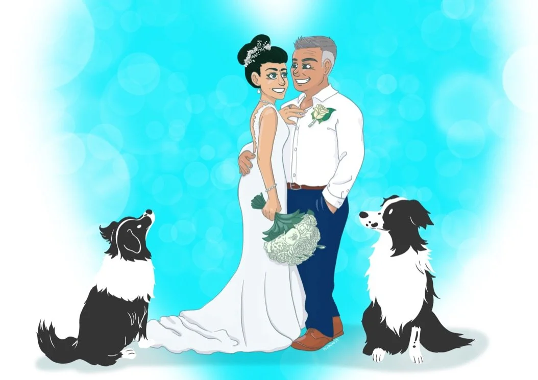 Digital illustration based off several photographs from the client. The client wanted a stylized version of her wedding picture along with addition of their dogs.