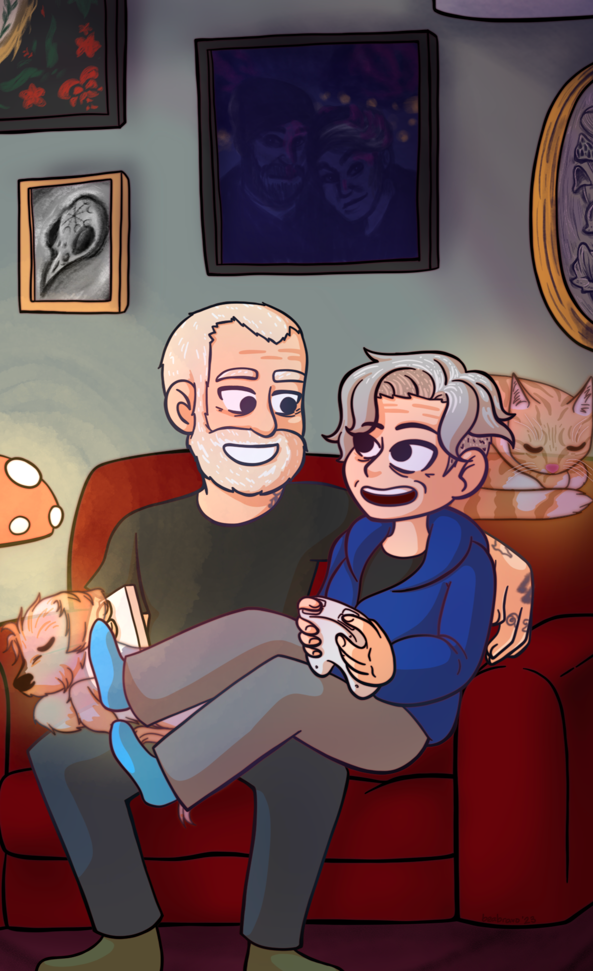 Stylized artwork of what the couple would look like in the future, along with their pets.