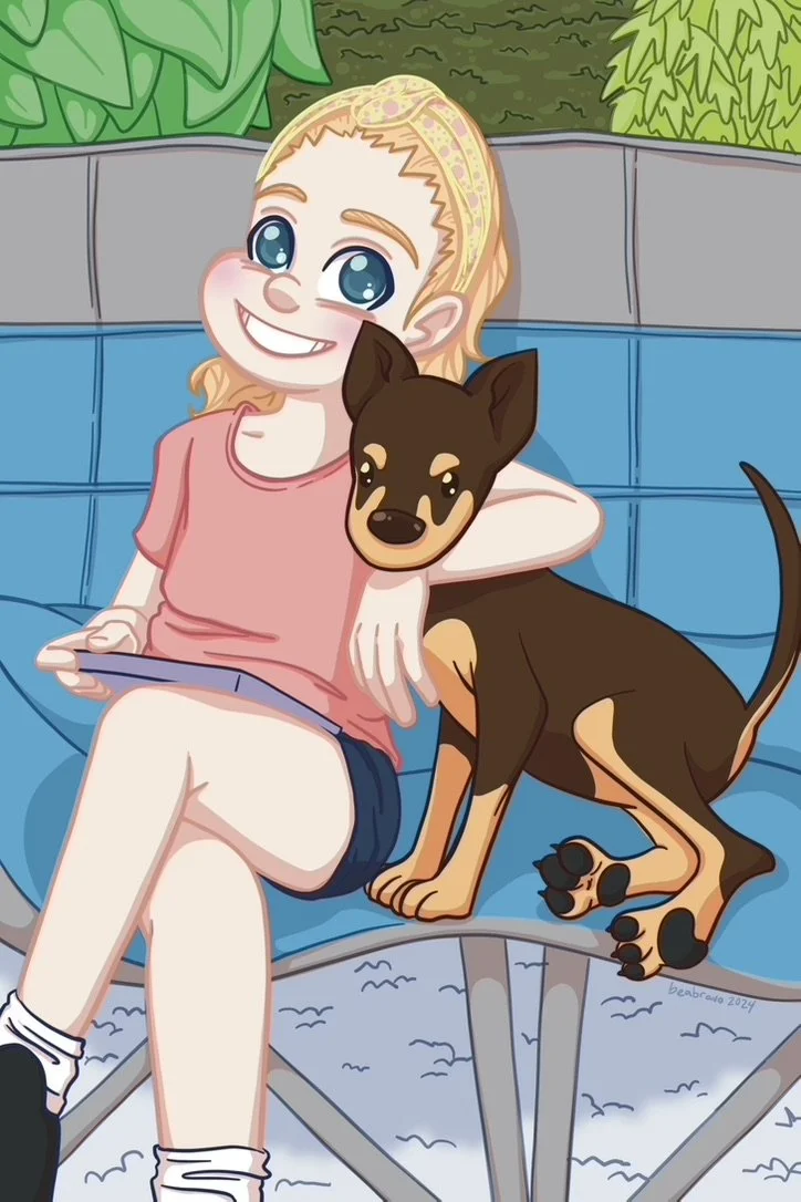 Artwork based off of a photo the client provided. Re-drew the photo as a cute cartoony version of the girl and her puppy.