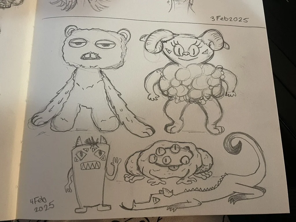 From pencil sketch of various weird creatures to using gouache paint to bring them to life.